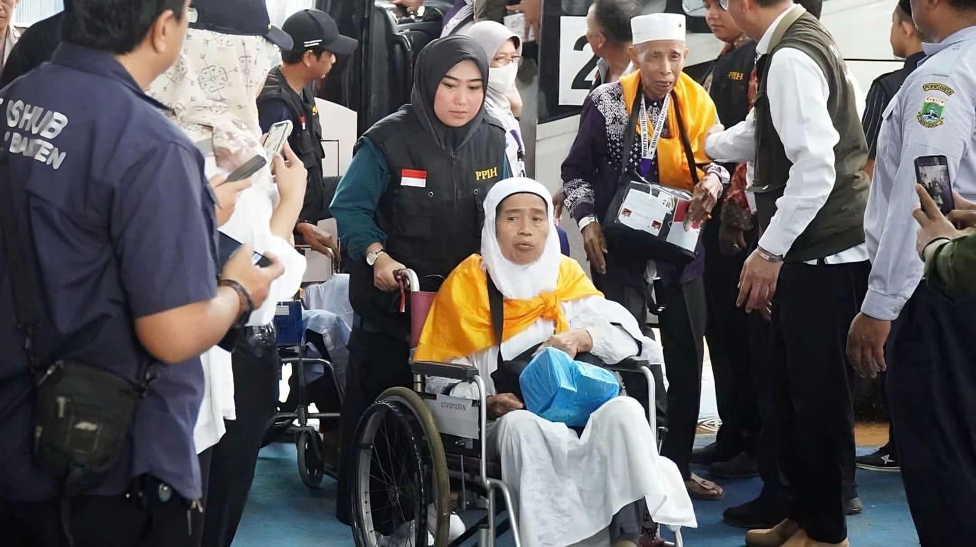 Pandeglang-Jemaah haji asal Kabupaten Pandeglang yang tergabung dalam kloter 15 tiba di tanah air, Jumat (28/6/2024). Momentum kedatangan jemaah haji tersebut tidak disia-siakan Bupati Pandeglang, Irna Narulita untuk menjemput langsung ke Asrama Haji Provinsi Banten Cipondoh, Kota Tangerang.