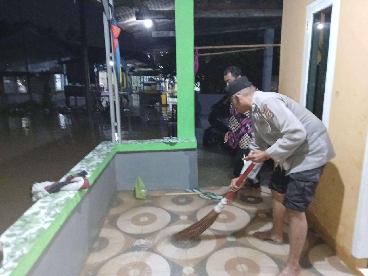 Lebak-Anggota Polsek Rangkasbitung, membantu membersihkan rumah warga kampung Tari Kolot, Kelurahan Cijoro Pasir, Kecamatan Rangkasbitung yang terdampak banjir akibat hujan lebat, Kamis (4/Juli/2024) petang.