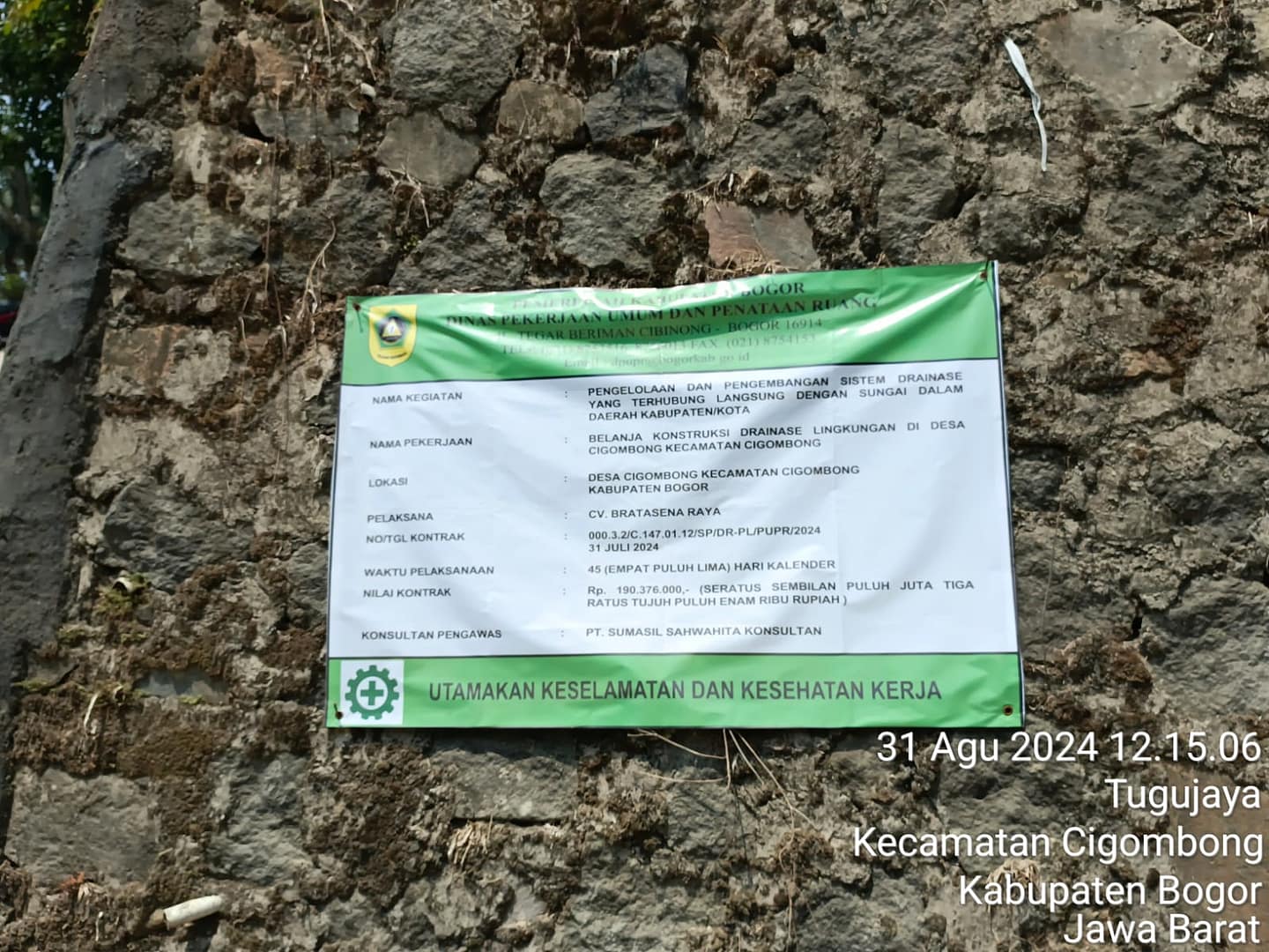 Di Desa Cigombong, Kecamatan Cigombong, Kabupaten Bogor, proyek ini telah mendapatkan alokasi anggaran sebesar Rp. 190.376.000,00. CV. Bratasena Raya dipercaya sebagai pelaksana proyek ini, yang dimulai pada Sabtu, 31 Agustus 2024.