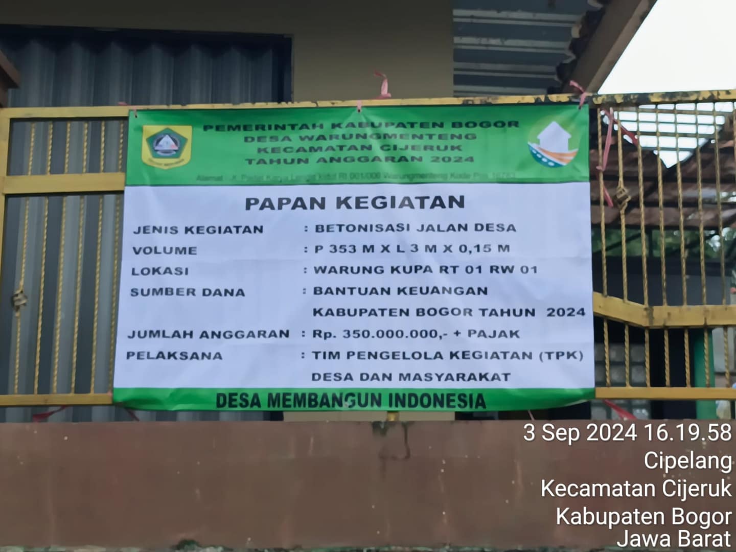 BOGOR,12 September 2024 – Program Satu Milyar Satu Desa, yang lebih dikenal dengan sebutan SAMISADE, merupakan inisiatif bantuan keuangan yang diberikan oleh Bupati Bogor dan hanya tersedia di Kabupaten/Kota Bogor. Program ini bertujuan untuk mendukung perputaran roda perekonomian masyarakat setempat. Pada Kamis, 12 September 2024, salah satu desa penerima manfaat dari program ini adalah Desa Warungmenteng, yang terletak di Kecamatan Cijeruk, Kabupaten Bogor, Jawa Barat.
