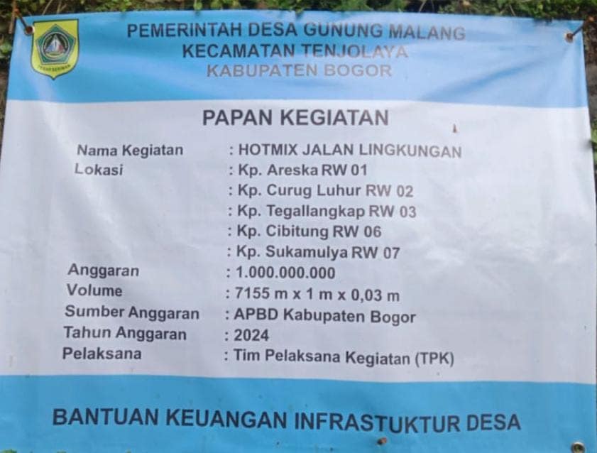 Total anggaran yang dialokasikan untuk proyek ini mencapai Rp. 1 miliar, dengan volume pekerjaan sepanjang 7155 meter, lebar 1 meter, dan ketebalan 0,03 meter.
