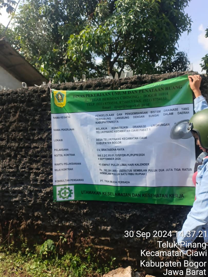 Bogor, 2 Oktober 2024 – Dinas Pekerjaan Umum dan Penataan Ruang Kota/Kabupaten Bogor kembali mengalokasikan anggaran sebesar Rp. 192.391.000,- untuk pengelolaan dan pengembangan sistem drainase yang terhubung langsung dengan sungai di Desa Telukpinang, Kecamatan Ciawi, Kabupaten Bogor, Jawa Barat.