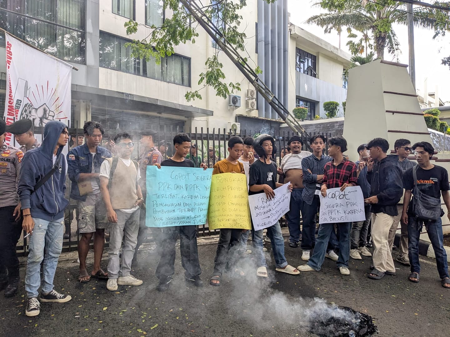 Aksi sempat diwarnai ketegangan ketika massa membakar ban dan berusaha masuk ke area kantor Dinas Perkim Banten. Namun situasi berhasil dikendalikan oleh aparat kepolisian yang berjaga di lokasi.